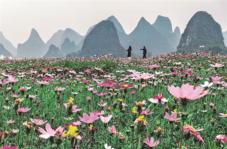 广西桂林,利用“冬闲田”种植的花卉吸引游客前来观赏。新华社发