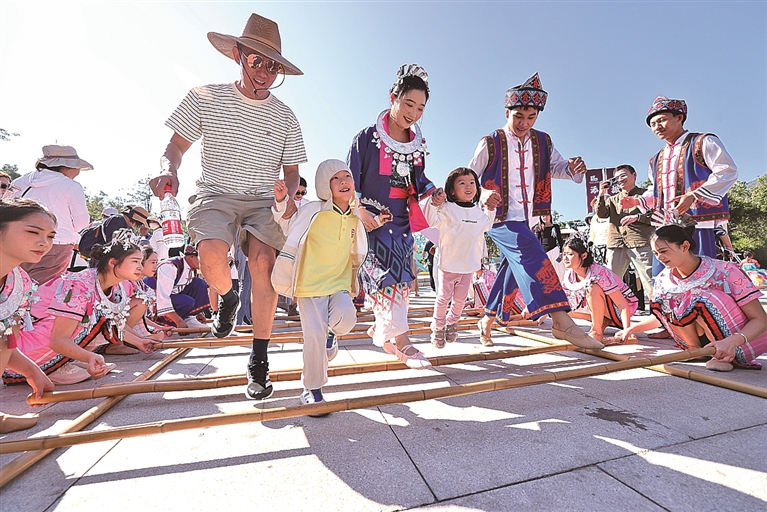 游客在海南三亚南山文化旅游区跳竹竿舞。新华社发